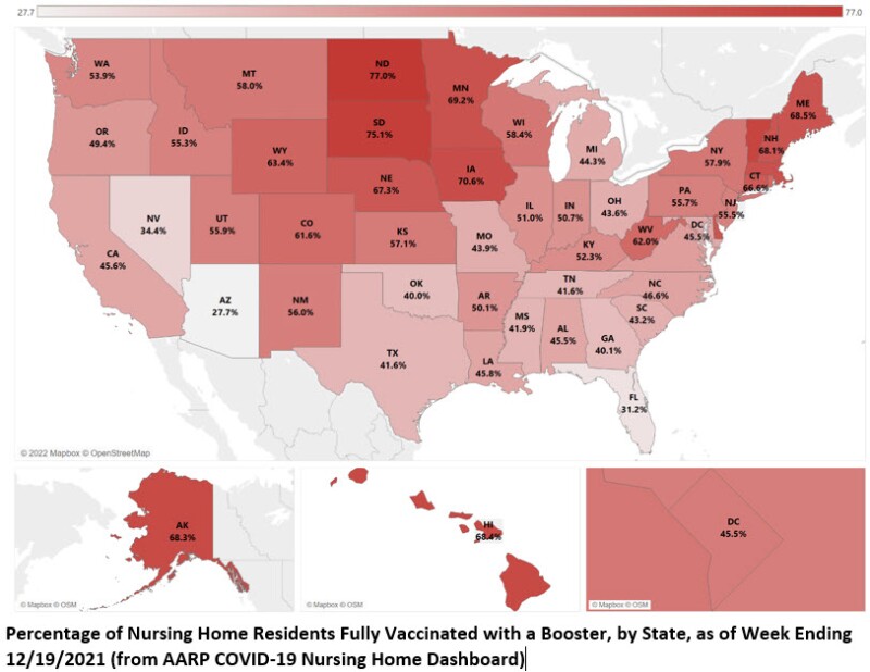 One of the most important tools to protect nursing home residents and staff is vaccination. According to the AARP Nursing Home COVID-19 Dashboard, about seven out of eight nursing home residents were fully vaccinated as of mid-December, and about half had also received a booster dose. More than four in five health care staff in nursing homes were fully vaccinated, but only one in five had received a booster shot[1].