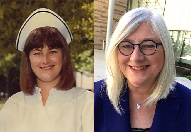 Left: Early in Young’s career, when she had a BS in dietetics and an associate degree in nursing. Right: Young at UC Davis, where she is professor and founding dean emerita of the Betty Irene Moore School of Nursing.