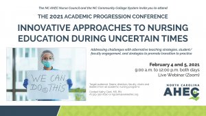 The NC AHEC Nurse Council and the NC Community College System invite you to attend the 2021 Academic Progression Conference: “Innovative Approaches to Nursing Education during Uncertain Times,” a live webinar from 9 a.m. to 12 p.m. on February 4 and 5, 2021, that will address challenges with alternative teaching strategies, student/faculty engagement, and strategies to promote transition to practice. Target audience: Deans, directors, faculty, chairs, and leaders from all academic nursing programs. For more information, contact Kathy Clark, MS, RN, at 919-350-8740 or kgclark@wakeahec.org. https://www.wakeahec.org/datafiles/2021_academic_progression_postcard_v2.pdf