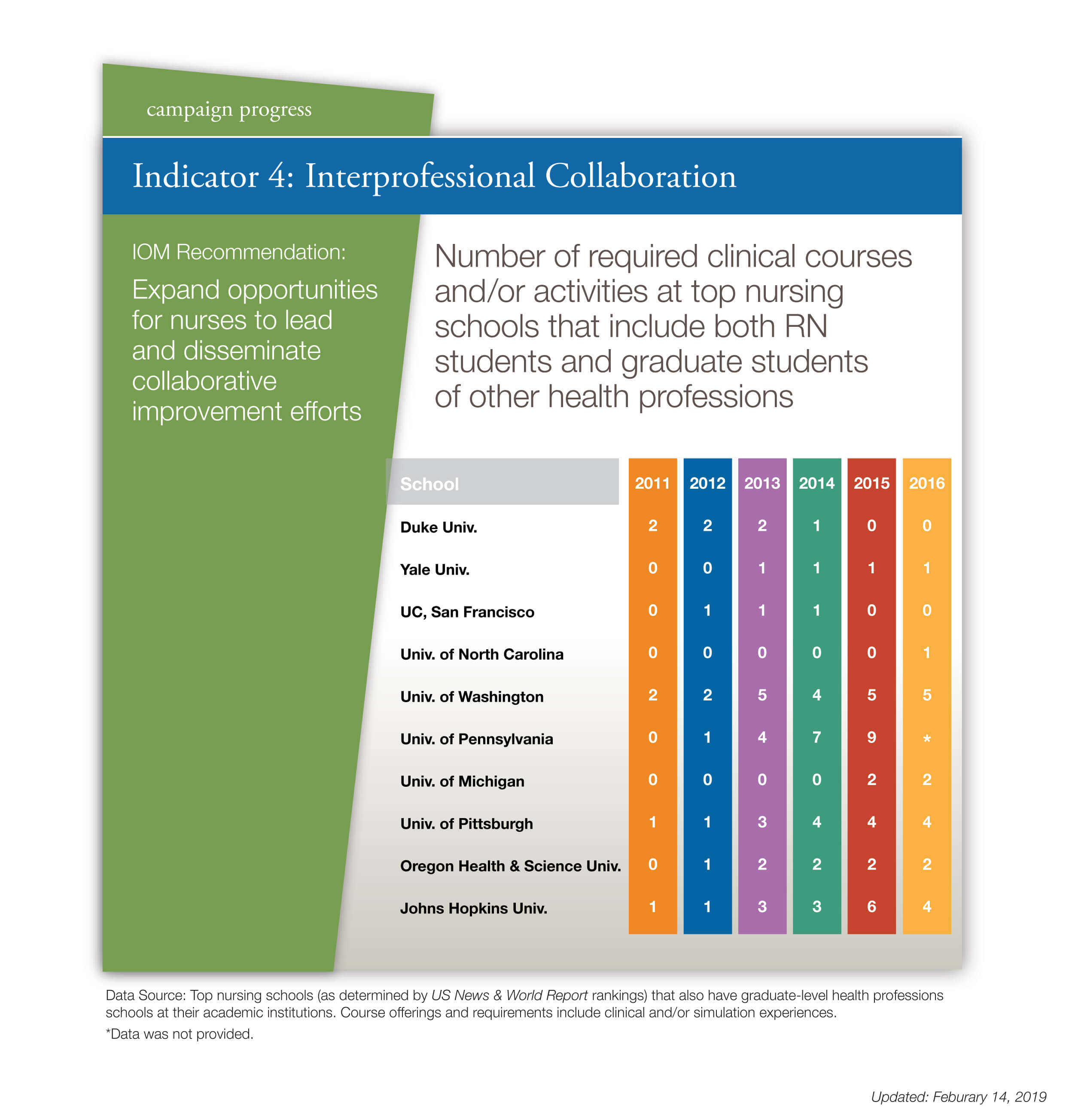 Issues: Building Healthier Communities, Collecting Workforce Data, Fostering Interprofessional Collaboration, Improving Access to Care, Increasing Diversity in Nursing, Promoting Nursing Leadership, Transforming Nursing Education, Tools & Tips: Dashboard Indicators, Milestones, Location: National,