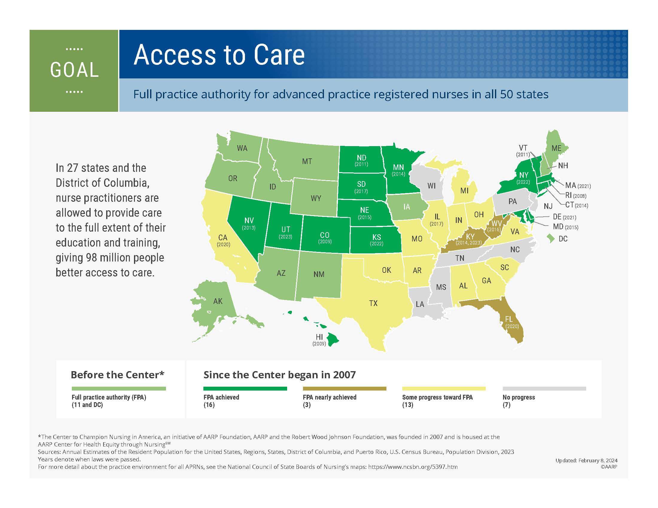 State laws and federal policies are among factors that keep nurses from contributing all they can to America’s health needs and wellness. The Campaign for Action is pushing for changes that would allow nurses to practice to the full extent of their education and training. Lifting restrictions means that more Americans will have better access to high-quality, affordable health care when and where they need it, including in rural and other underserved areas of the country. Prioritizing access for all is essential to achieving health equity.