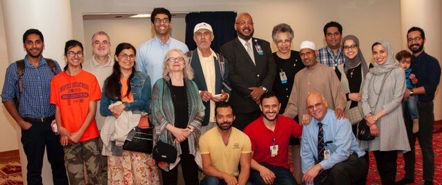 Washington (second row, 7th from the right) celebrates Iftar, the evening meal Muslims eat to end their daily fast during Ramadan, with colleagues at MGH.