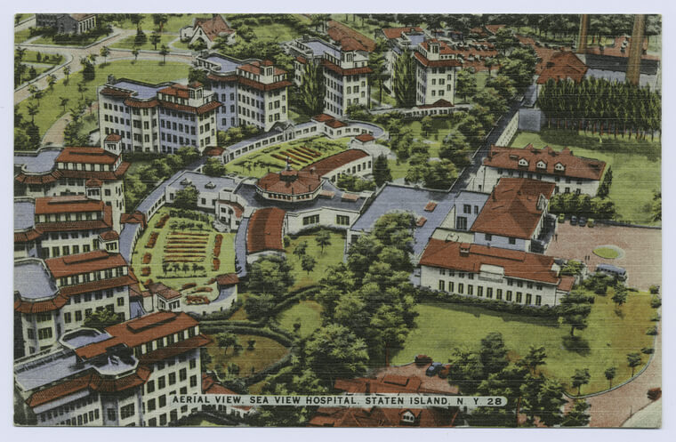 Caption 1: Irma and Paul Milstein Division of United States History, Local History and Genealogy, The New York Public Library. “Aerial View Sea View Hospital, Staten Island N.Y. 28” New York Public Library Digital Collections. Accessed January 25, 2024. https://digitalcollections.nypl.org/items/510d47d9-cb86-a3d9-e040-e00a18064a99