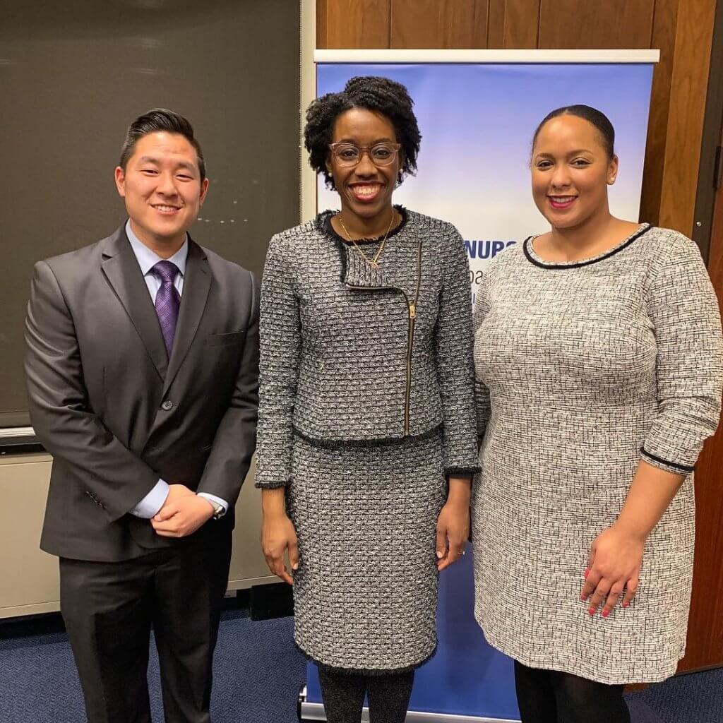 Underwood, center, is flanked by Center to Champion Nursing in America staff Scott Tanaka, left, and Jazmine Cooper, right.